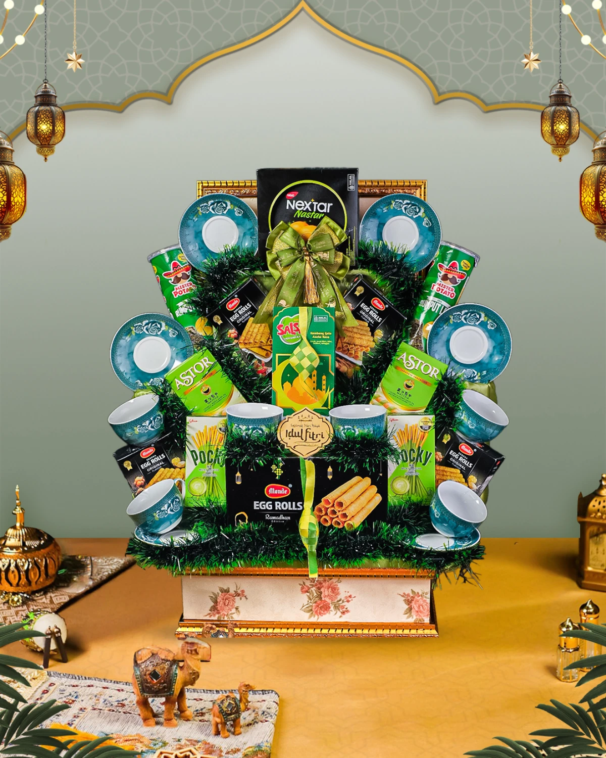 Parcel Signature Eid 04 Parcel Mix yang berisi 6 Pcs Cangkir & Saucer, Nastar Kemasan, Wafer Stick, Wafer Roll, dan Makanan Ringan Lainnya Yang Cocok Untuk Keluarga
