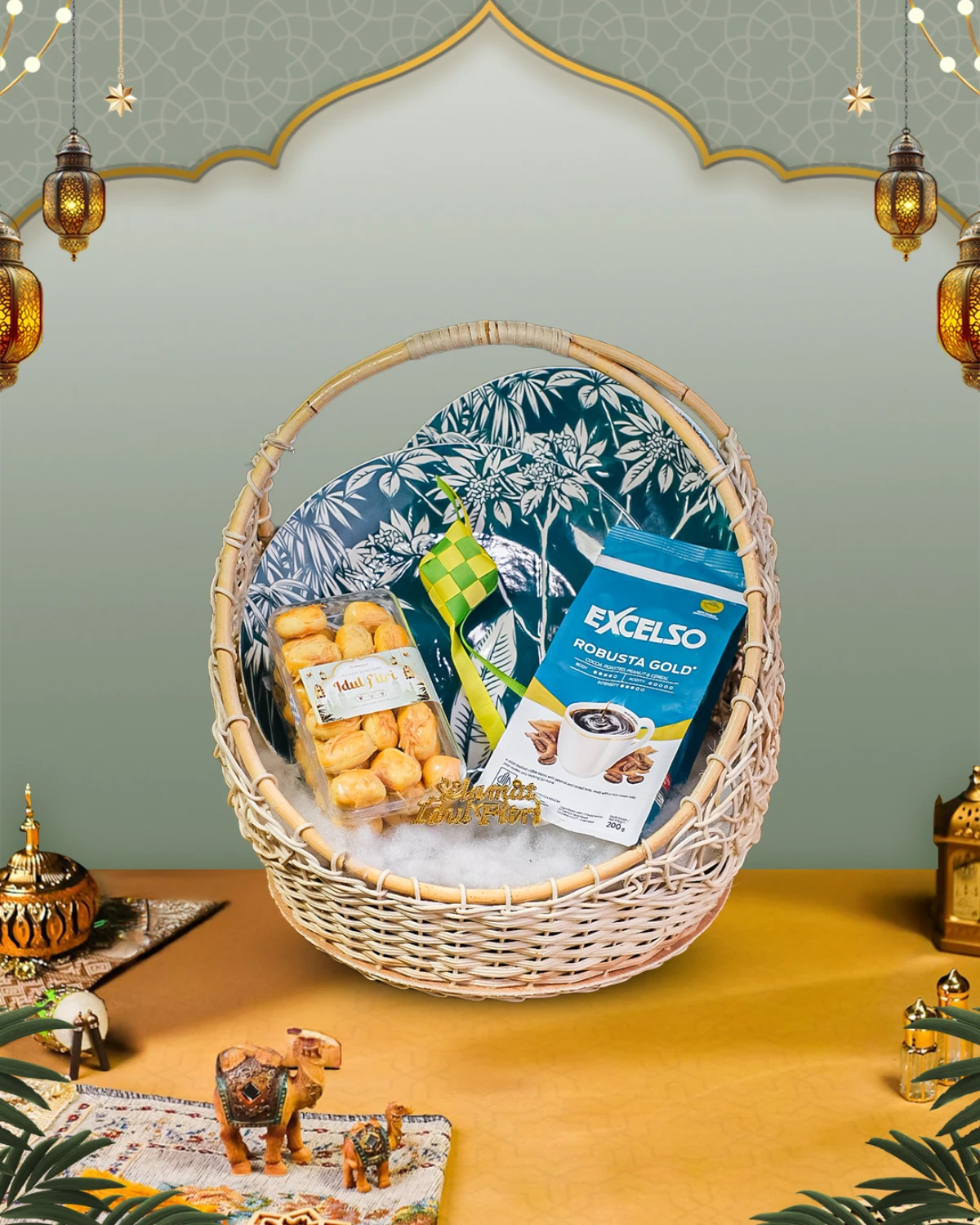 Parcel Signature Eid 13 Parcel Mix yang berisi 2 Pcs Dinner Plate, Coffee Excelso, Kue Kering, dan Eid Decoration Yang Cocok Untuk Teman/Kolega