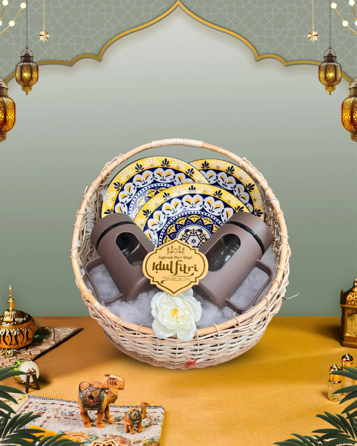 Parcel Signature Eid 24 Parcel Mix yang berisi 3 Pcs Dinner Plate, 2 Pcs Botol Mug, dan Eid Decoration Yang Cocok Untuk Teman/Kolega