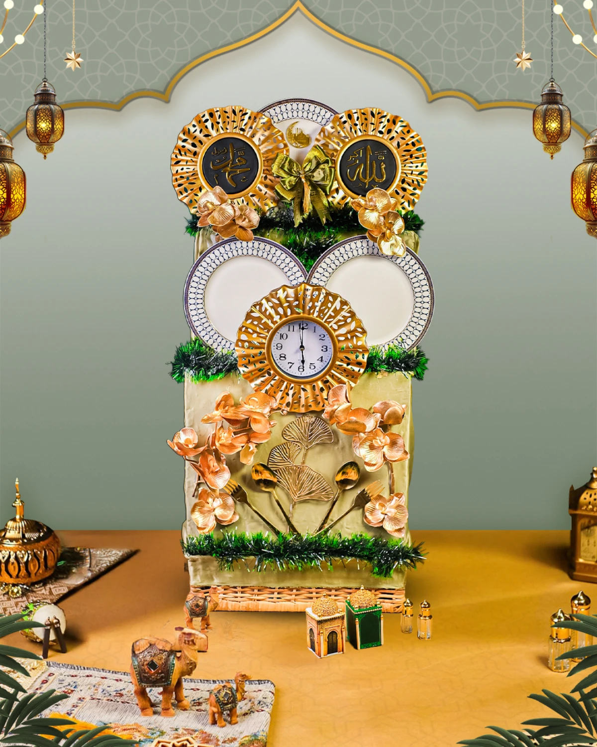 Parcel Signature Eid 25 Parcel Mix yang berisi 3 Pcs Dinner Plate, 2 Pcs Hiasan Dinding, Jam Dinding, dan Eid Decoration Yang Cocok Untuk Keluarga