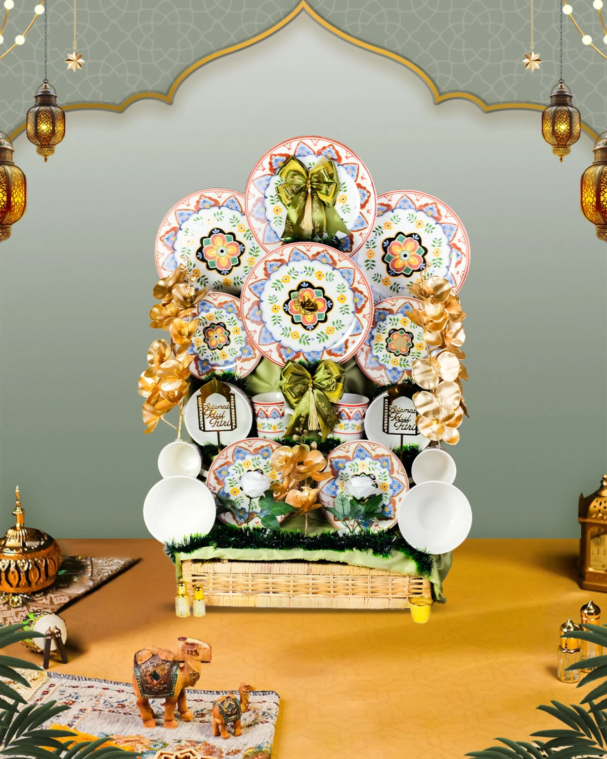 Parcel Signature Eid 26 Parcel Pecah Belah yang berisi 4 Pcs Dinner Plate, 4 Pcs Salad Plate, 4 Pcs Bowl, 4 Pcs Mug,dan Eid Decoration Yang Cocok Untuk Rekan Bisnis