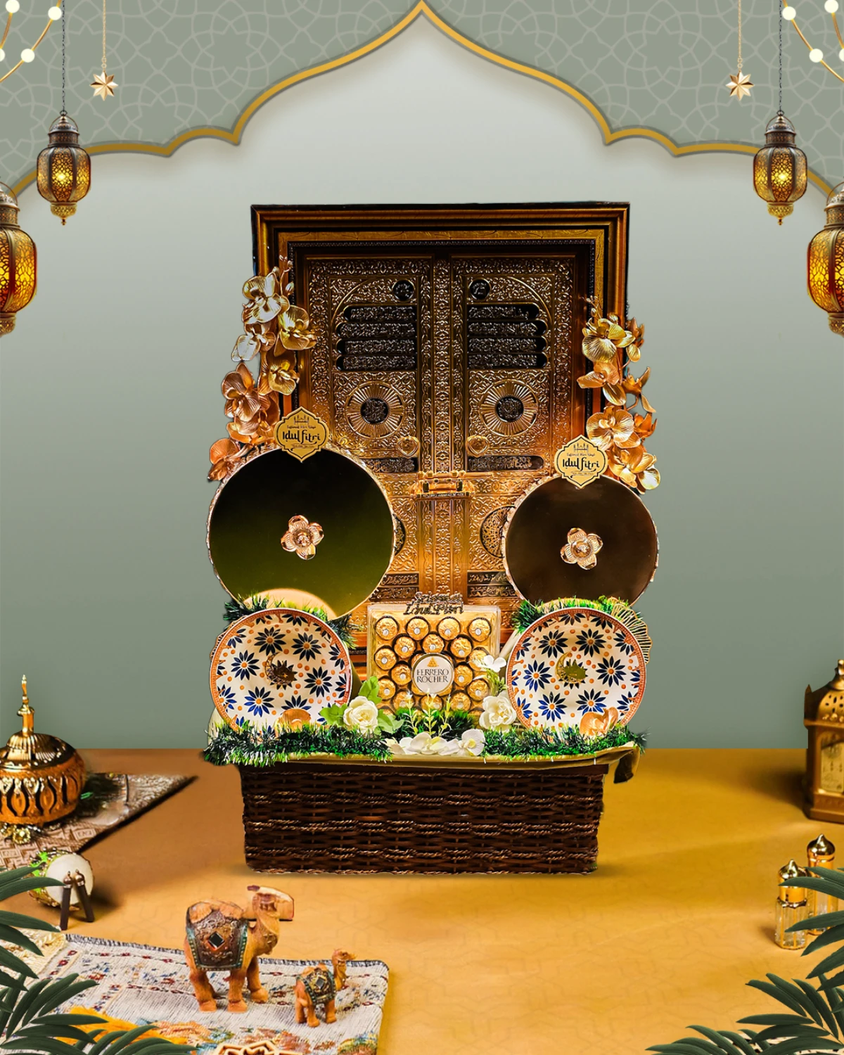 Parcel Signature Eid 28 Parcel Mix yang berisi Chocolate Ferrero Rocher, 2 Pcs Bowl, Kaligrafi, 2 Pcs Tempat Kue, dan Eid Decoration Yang Cocok Untuk Keluarga