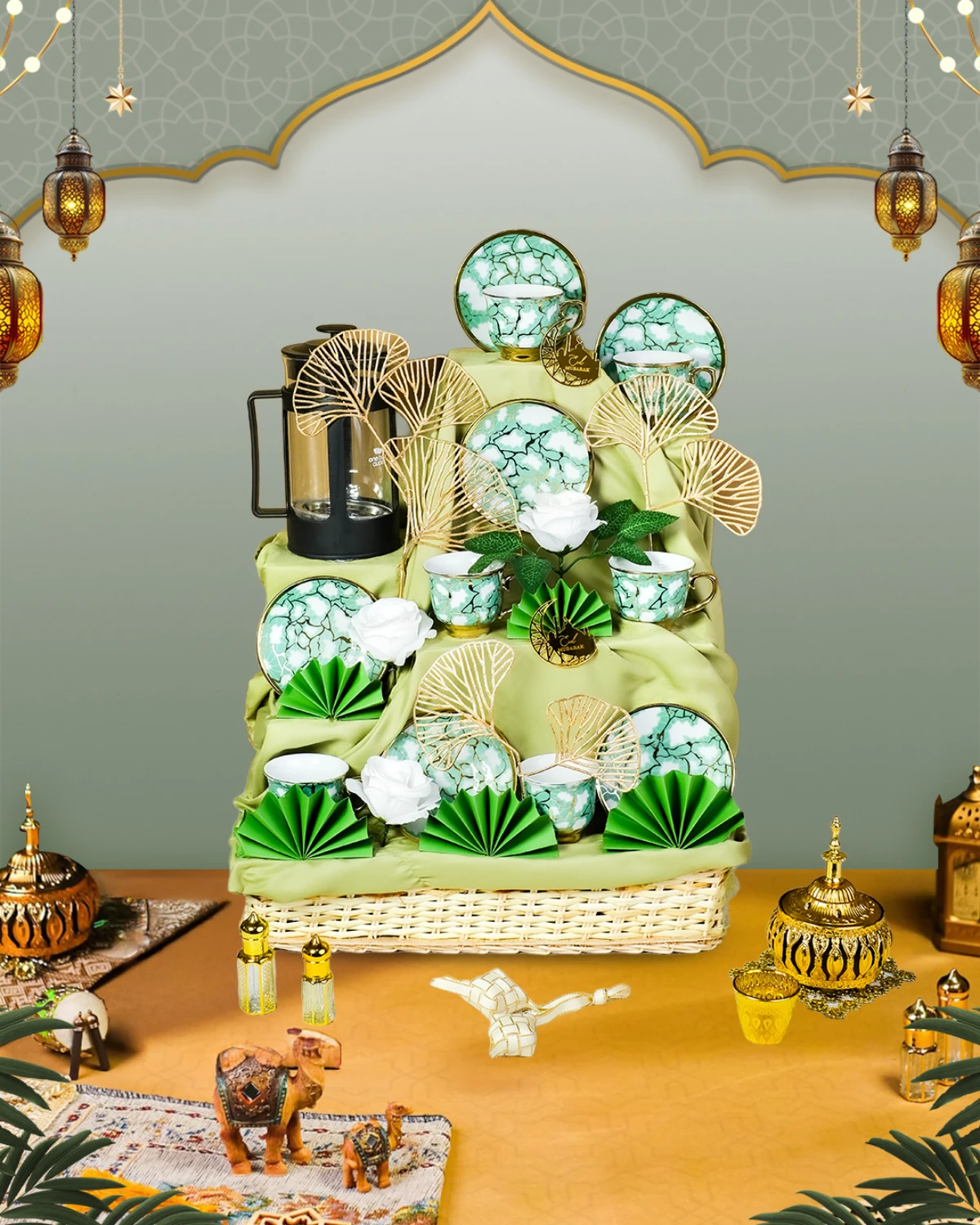 Parcel Signature Eid 32 Parcel Mix yang berisi French Press Coffee, 6 Pcs Tea Cup & Saucer, dan Eid Decoration Yang Cocok Untuk Keluarga & Kolega