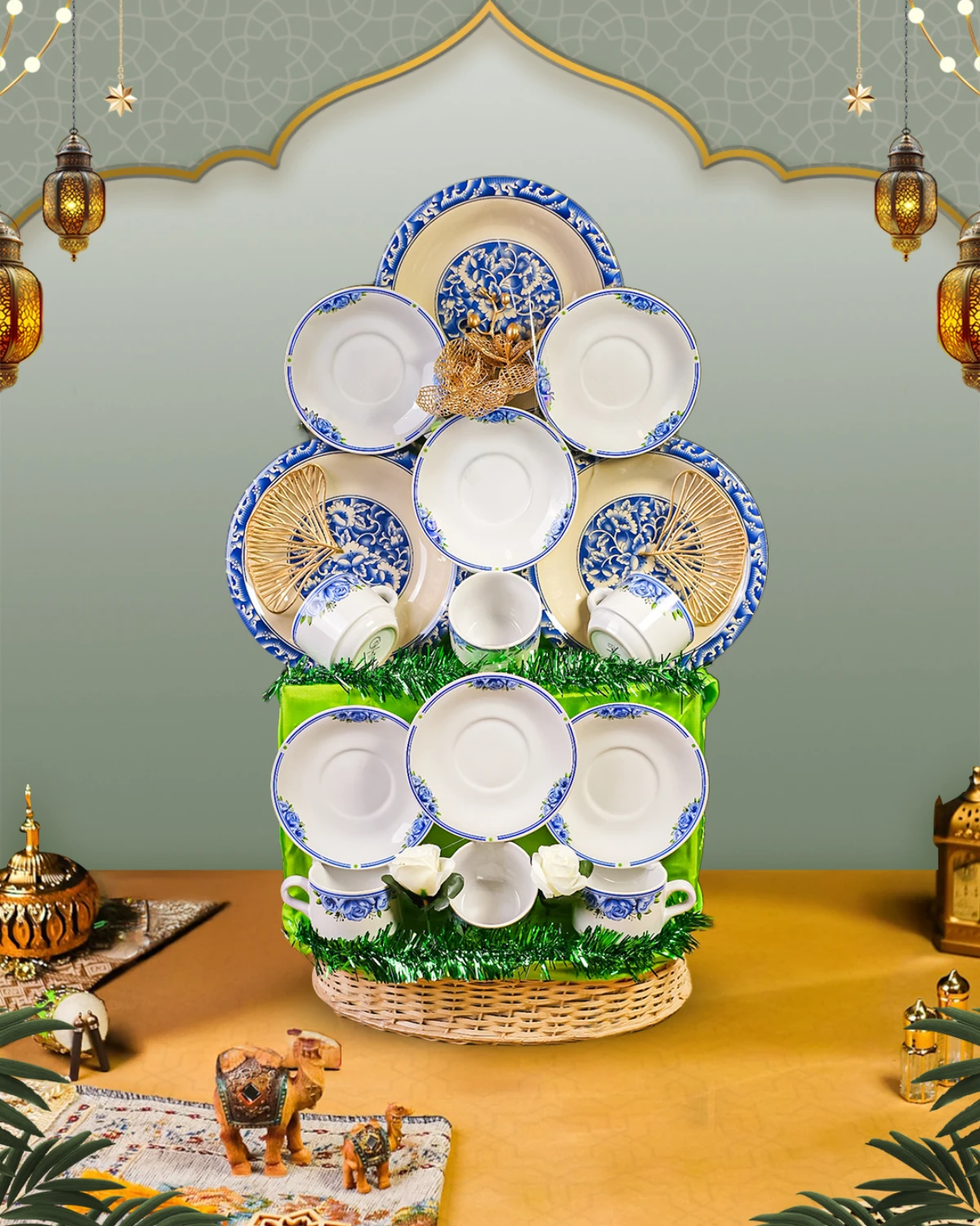 Parcel Signature Eid 35 Parcel Pecah Belah yang berisi 3 Pcs Dinner Plate, 6 Pcs Tea Cup & Saucer, dan Eid Decoration Yang Cocok Untuk Rekan Bisnis