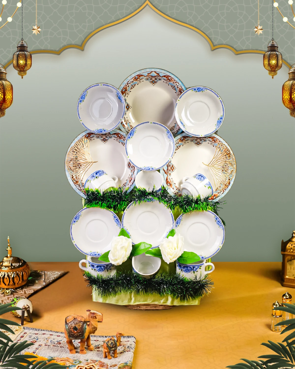 Parcel Signature Eid 36 Parcel Pecah Belah yang berisi 3 Pcs Dinner Plate, 6 Pcs Tea Cup & Saucer, dan Eid Decoration Yang Cocok Untuk Rekan Bisnis