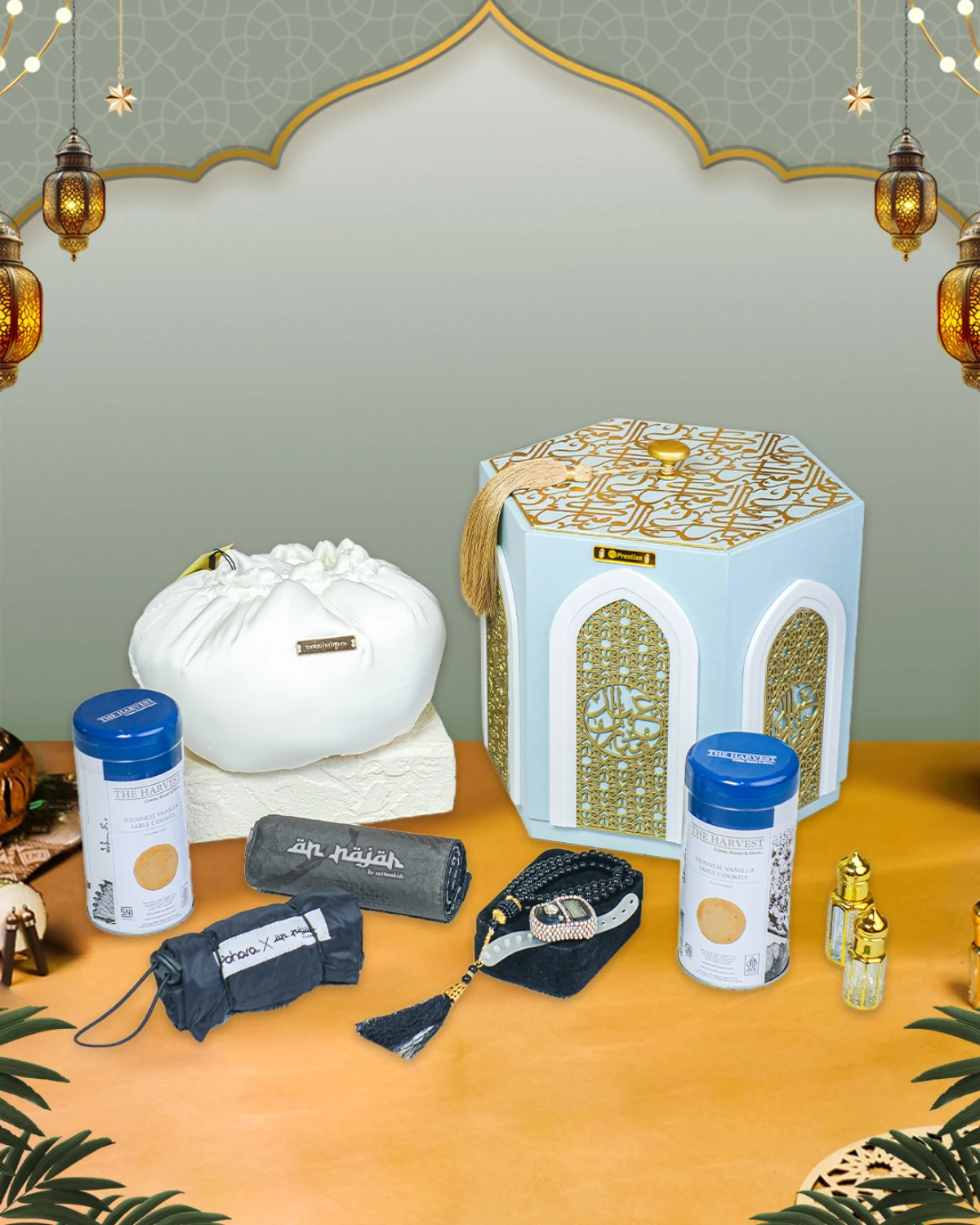 Parcel Signature Eid 47 Parcel Mix yang berisi 2 Pcs Cookies Harvest, Mukena, Peci, Sajadah Travel, dan Set Tasbih Digital Yang Cocok Untuk Keluarg