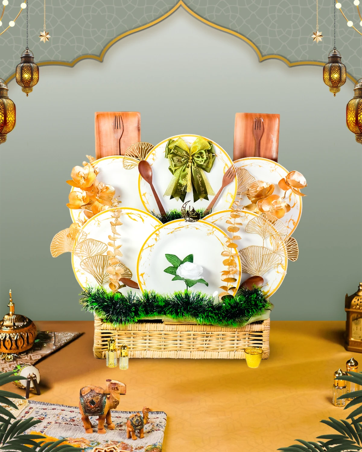 Parcel Signature Eid 55 Parcel Pecah Belah yang berisi 6 Pcs Dinner Plate, 3 Pcs Garpu, 3 Pcs Sendok, dan Eid Decoration Yang Cocok Untuk Keluarga