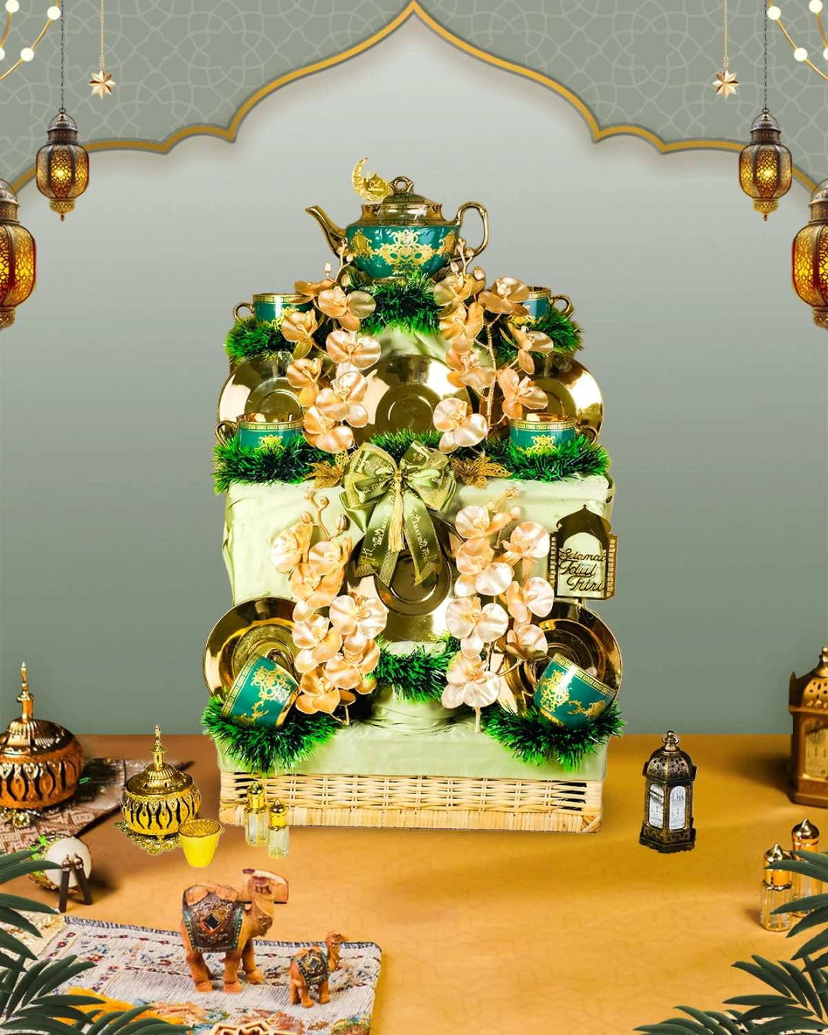 Parcel Signature Eid 56 Parcel Pecah Belah yang berisi Teko, 6 Pcs Mug & Saucer, dan Eid Decoration Yang Cocok Untuk Rekan Bisnis